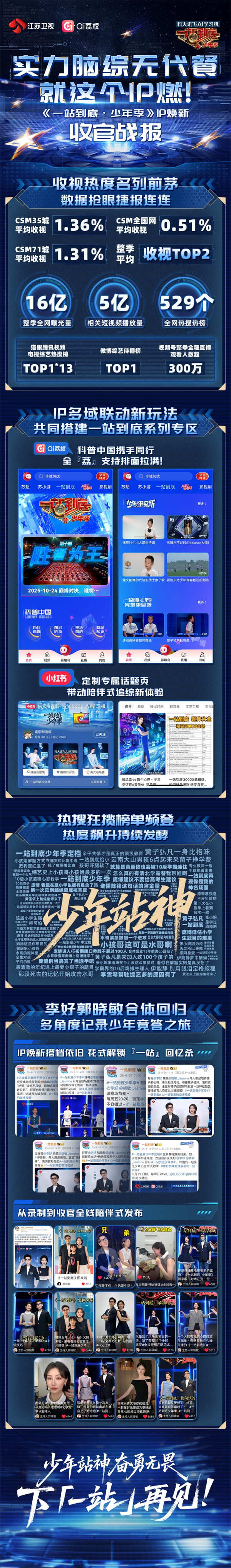 自8月22日开播以来,《一站到底·少年季》持续领跑同档期综艺赛道。收视方面,节目CSM35城与71城平均收视率均突破1%,稳居多网别同时段收视TOP2,展现出强大的观众黏性。网络热度全面引爆,整季全网曝光量超16亿,相关短视频播放量累计达5亿,强势斩获全网热搜热榜529个。