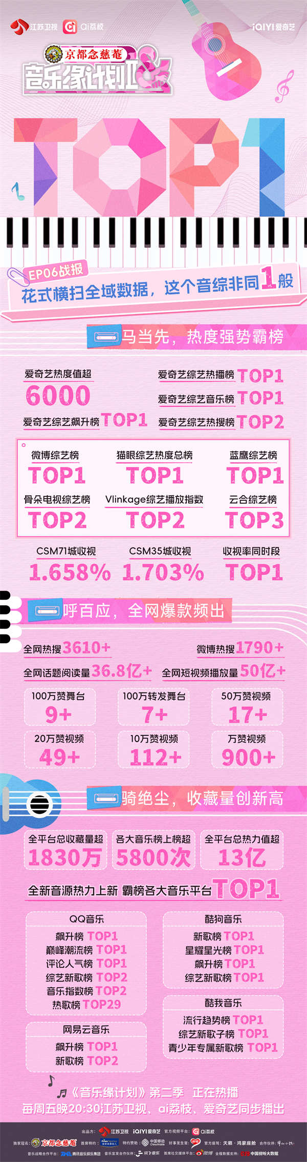 节目播出后,台网数据继续全线飘红!节目收视CSM71城1.658%,CSM35城1.703%,居省级卫视同时段Top1。在各大社交平台,揽获全网热搜3610+,其中微博热搜1790+个,全网相关话题阅读量突破36.8亿+,短视频播放量达50亿+。节目歌曲在各大音乐平台收藏量累计突破1830万,总热力值超13亿,总上榜量达5800次,霸榜QQ音乐、酷狗音乐、网易云音乐、酷我音乐等各大音乐平台Top1。