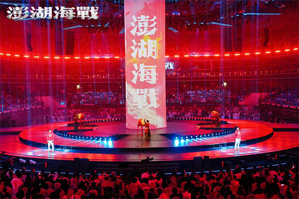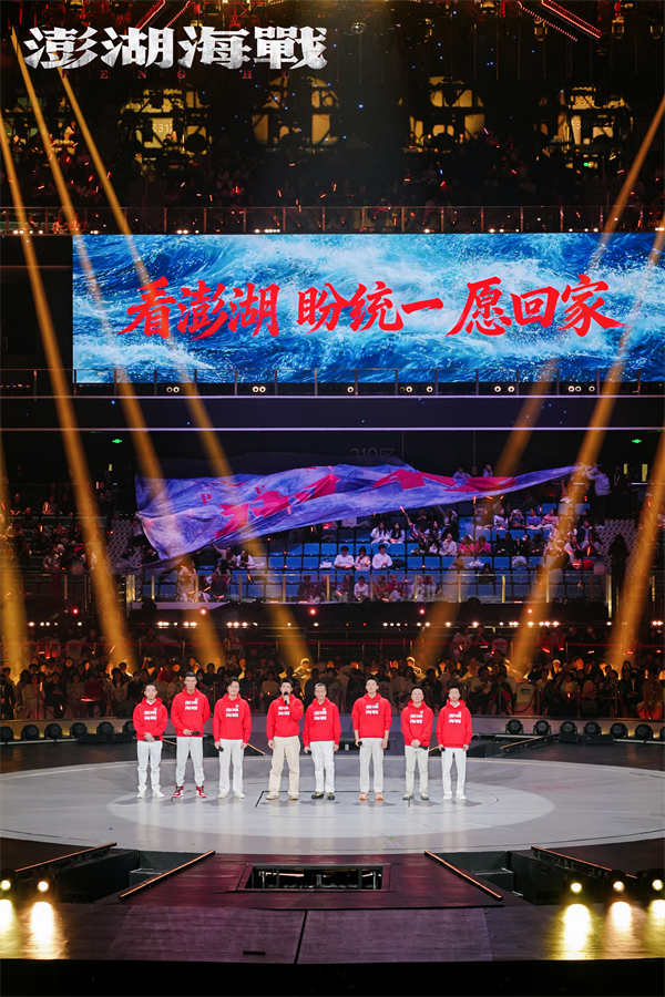 当日,由国家电影局指导,中国电影家协会支持,中宣部电影频道节目中心、四川省电影局、成都市委宣传部主办的"光影绽放·中国电影120周年活力之夜"的活动在成都市高新区万人体育中心举行。电影《澎湖海战》的演员王学圻、杜江、侯雯元、耿乐、胡明、王雨甜、王乃训、刘学参加活动,当晚本片的两位演员代表杜江、侯雯元在万人体育中心现场唱响电影宣传致敬曲《澎湖》,同时一面200平米的电影《澎湖海战》巨幅海报也缓缓地在观众席中伸展开来,巨幅海报亮相的同时,体育中心半空中一块100多平米的电子大屏上跳出“看澎湖 盼统一 愿回家”9个大字!演唱结束后,电影《澎湖海战》8位演员一起上台向观众推荐该片,齐声道出推荐语:“2026,看澎湖,盼统一,愿回家!”
