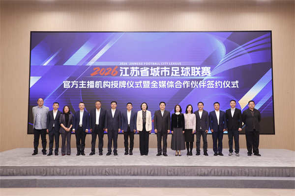 “苏超”新赛季开赛在即,江苏省广播电视总台作为唯一公用信号服务机构,将继续向全国各大媒体提供标准统一、制作精良的公用信号。活动现场,江苏省体育产业集团党委书记、董事长、江苏省体育总会副会长顾晔与江苏省广播电视总台党委委员、副台长、集团副总经理何可一完成2026江苏省城市足球联赛官方主播机构的授牌仪式。