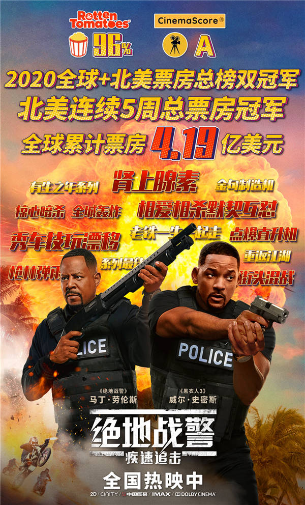 电影自北美上映以来口碑便刷爆全网,CinemaScore观众评分为A等级,烂番茄最新的观众喜爱指数始终保持在96%以上,成为北美2020年开年至今烂番茄观众喜爱指数排名第一的电影。截止目前北美收获2.04亿美金票房,全球票房收获超4.19亿美金,不仅创下了动作喜剧类系列电影的全球票房新纪录,同时也成为2020年开年至今全球及北美票房冠军。不仅是《绝地战警》系列诞生以来口碑最好的一部,也被媒体誉为电影市场近十年最成功的续作作品之一。今日国内正式上映,必将再度掀起一场暑期档的好莱坞动作大片观影狂潮。